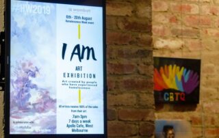 In August 2019, art displayed had been produced by young people who took part in Wombat Housing & Support Services art therapy sessions funded by the Awesome Foundation. Part of these workshops consisted of stencil art sessions run by Artist: ManOfDarkness from Blender Studios. Some independent artists are also included in this exhibition. All exhibited artworks have been created by artists who have experienced homelessness or are currently experiencing homelessness. It is a non-judgemental way for people to express what they have experienced in a safe environment without feeling the stigma often attached to the term ‘homeless’.” Creating art in order to connect with the community to increase awareness & understanding.