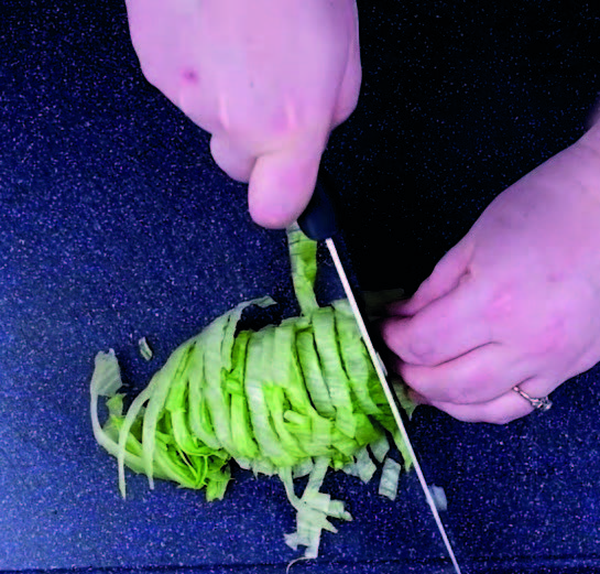 2. Roughly chop the lettuce and add to the bowl along with the baby spinach.